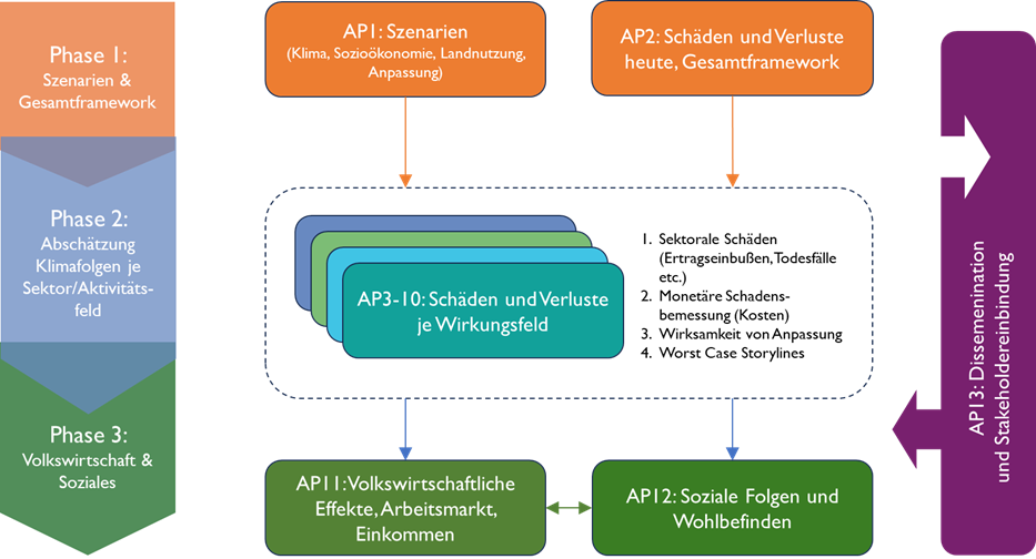 In Phase 1 werden die Grundlagen der verwendeten Klimaszenarien (RCP4.5 und RCP8.5 für 2050 und 2080), regionalisierte sozioökonomische und Landnutzungsszenarien (Shared Socioeconomic Pathways, SSPs) sowie Anpassungsszenarien erarbeitet. Neben den durchschnittlichen Schäden für die Klimaperiode um 2050 und 2080 wird zudem eine sogenannte Worst Case Storyline exemplarisch für ausgewählte Bereiche (Hochwasser an Flüssen; Gesundheit, Energie in reduziertem Umfang) ausgearbeitet. Der Storyline-Ansatz erlaubt, Schadensereignisse aus der Vergangenheit (z. B. ein Jahrhunderthochwasser oder eine extreme Hitzeperiode) in einem zukünftigen Klima und einem zukünftigen sozioökonomischen System (z. B. mehr ältere Bevölkerung) zu untersuchen oder Ereignisse, die bereits in einer Region aufgetreten sind, in andere Regionen zu verschieben. Als Basis für die Modellierung wird eine Abschätzung der bereits heute auftretenden Kosten (in den letzten beiden Jahrzehnten) im Zusammenhang mit extremen Wetterereignissen und Klimavariabilität erarbeitet. Dazu werden empirisch erhobene Schadensdaten (u.a. von Rückversichern etc.) kombiniert.